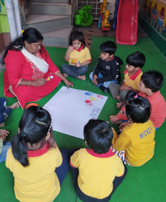 - Rhymes, action songs are part of daily curriculum helping the child improve vocabulary and socio-emotional skills.
